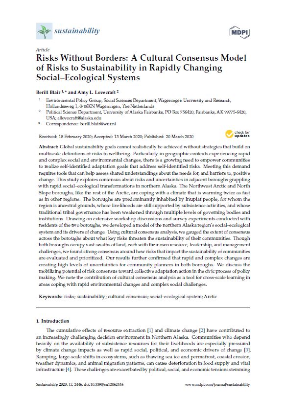 Blair, B., & Lovecraft, A. L. (2020). Risks Without Borders: A Cultural Consensus Model of Risks to Sustainability in Rapidly Changing Social–Ecological Systems. Sustainability, 12(6), 2446.