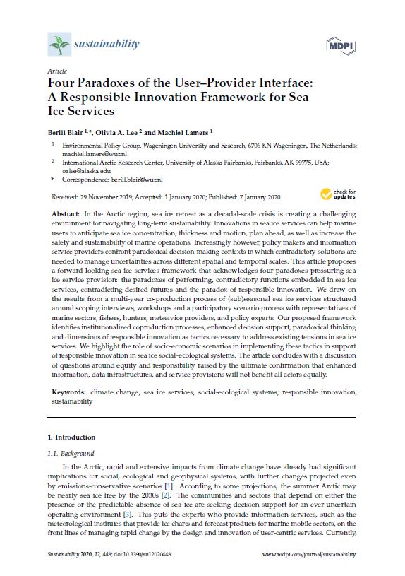 Blair, B., Lee, O. A., & Lamers, M. (2020). Four Paradoxes of the User–Provider Interface: A Responsible Innovation Framework for Sea Ice Services. Sustainability, 12(2), 448.