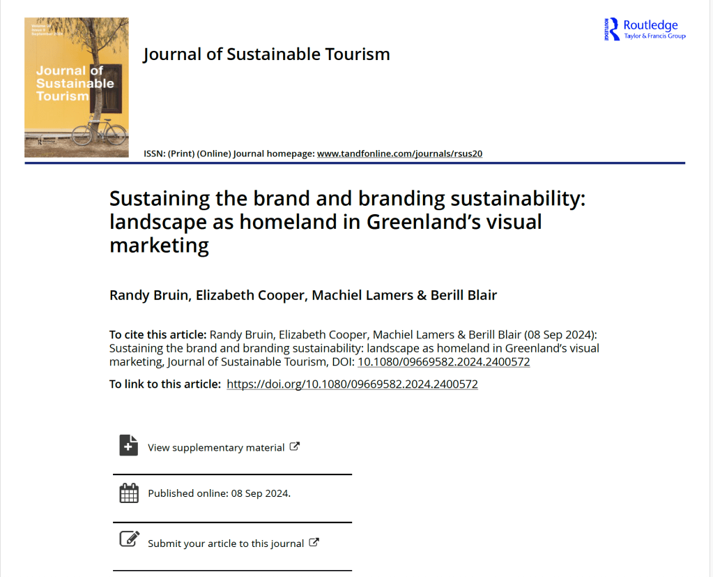 Bruin, R., Cooper, E., Lamers, M., & Blair, B. (2024). Sustaining the brand and branding sustainability: landscape as homeland in Greenland’s visual marketing. Journal of Sustainable Tourism, 1–19. https://doi.org/10.1080/09669582.2024.2400572