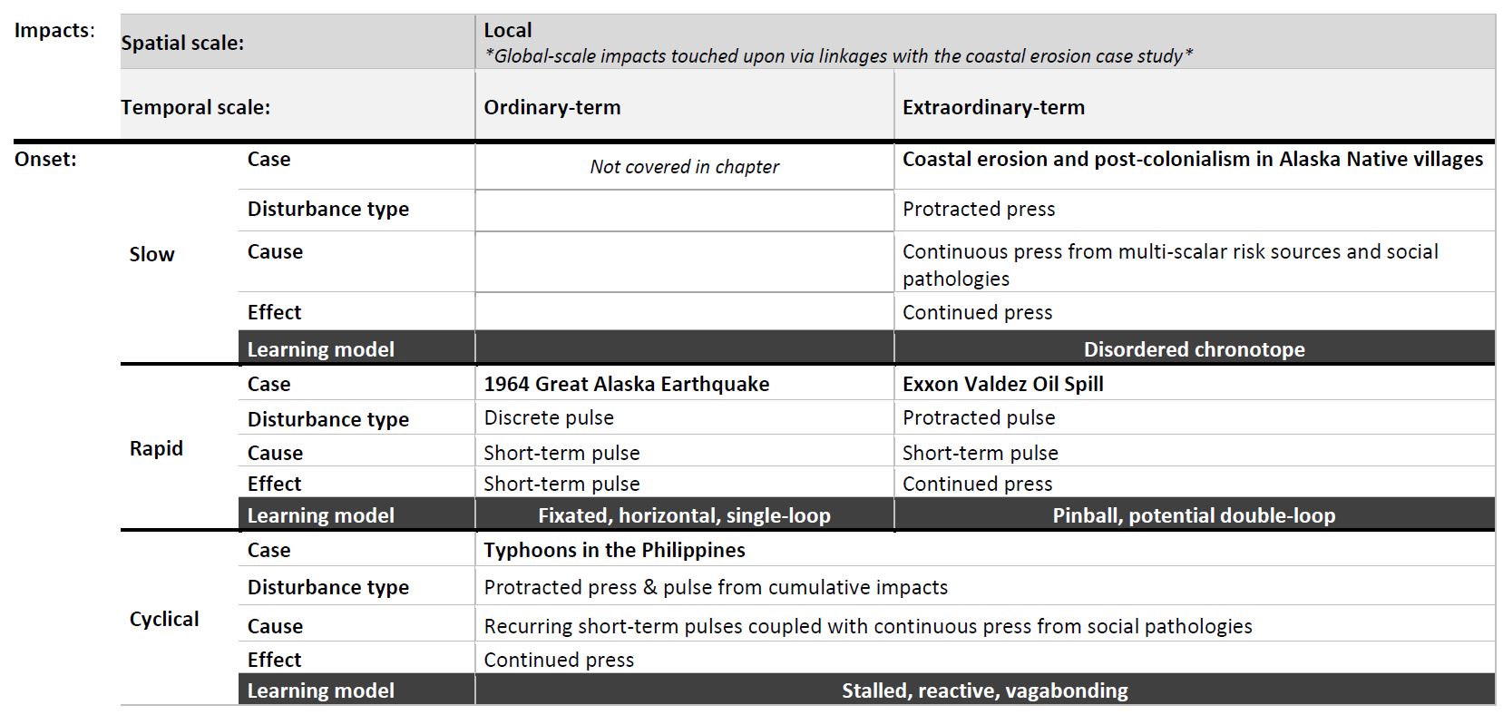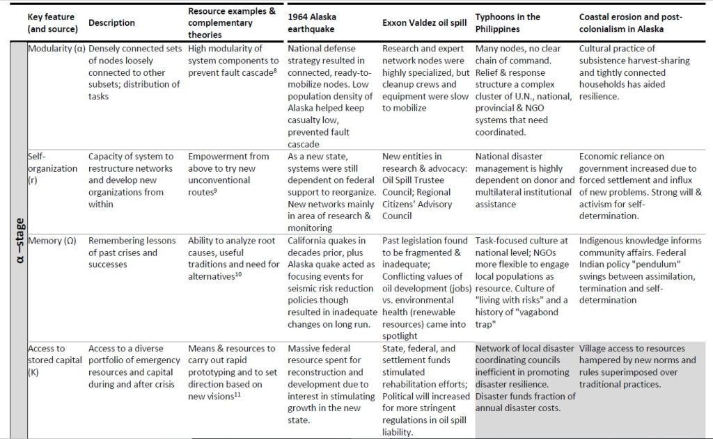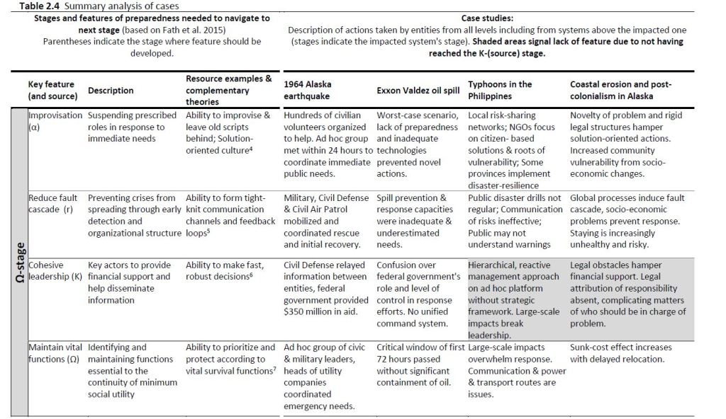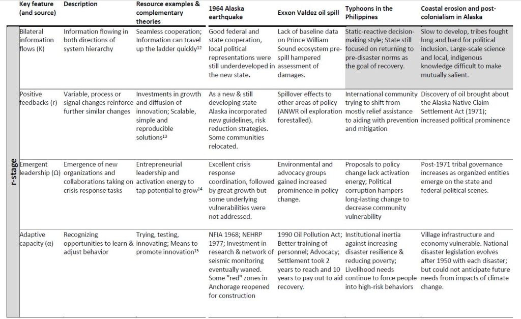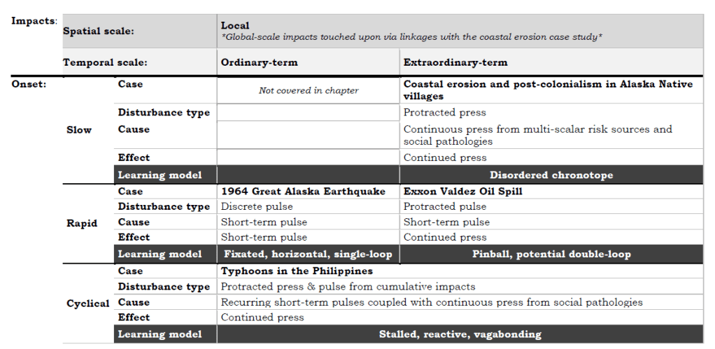 Using four very different types of disaster events: a magnitude 9.2 earthquake (1964 Alaska), a devastating oil spill (1989 Exxon Valdez, Alaska), recurring typhoon events (Philippines) and coastal erosion (Alaska), this research looked at how the impacted communities’ state and stage in the adaptive cycle created both adaptive capacities and vulnerabilities. The research also considered the type of disaster onset (slow, rapid, cyclical), the temporal extent of impacts (press or pulse) and whether impacts are global or local. These are all factors that shape disaster learning and the policies that ultimately govern preparedness and mitigation.
